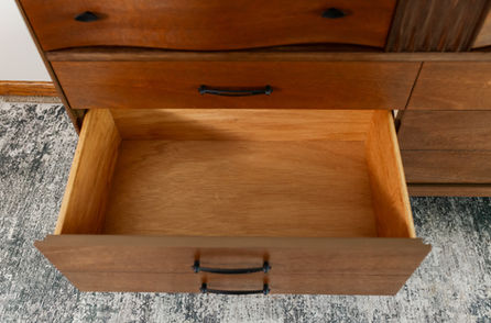 This vintage Mid Century Modern Dresser by Bassett has been fully reconditioned and is like new again! The mahogany wood has been stained to reduce redness, and several layers of a protective finish have been added for durability. The 6 dovetailed drawers are clean, conditioned, and slide beautifully.